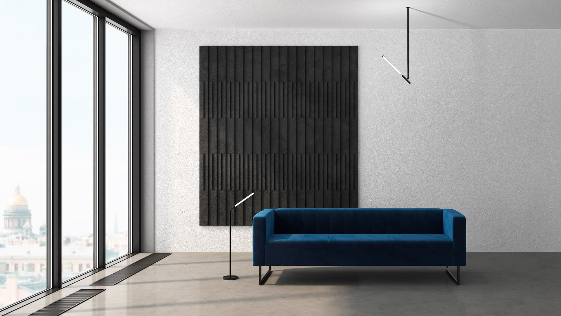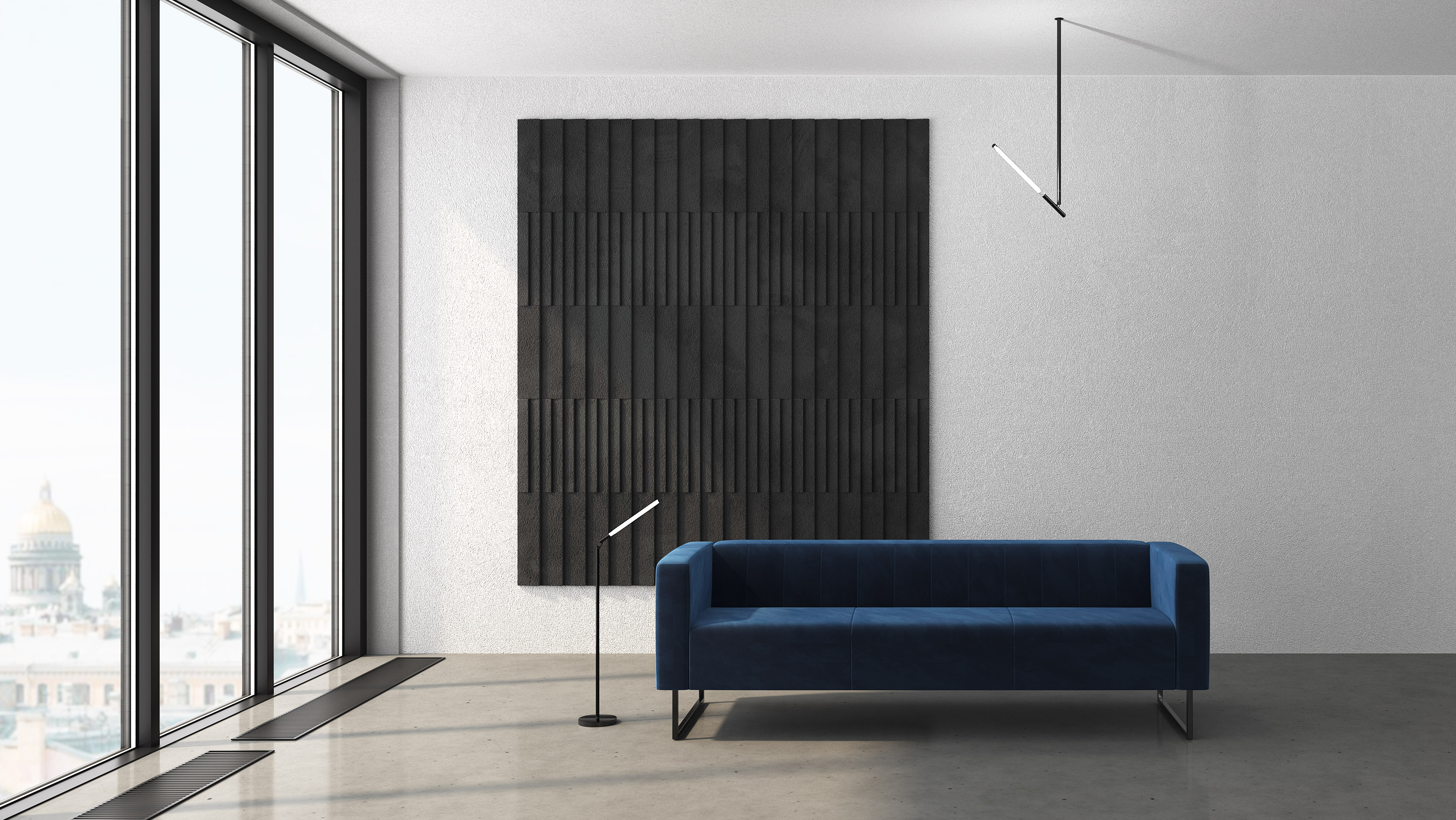 Лёгкая визуальная конструкция. Металлические опоры создают эффект «парения» мебели, придавая интерьеру лёгкость и актуальность